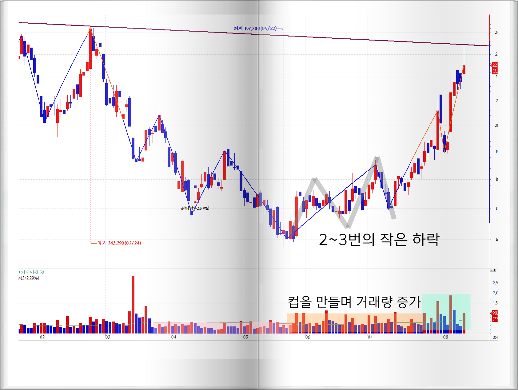 손잡이는 본격적인 상승 돌파 직전에 나타나는 마지막이자 가장 짧은 조정 구간입니다. 마침내 가격이 이전 고점 수준까지 회복되면, 마지막 '기생충'들이 본전을 찾았다는 안도감에 물량을 던집니다.