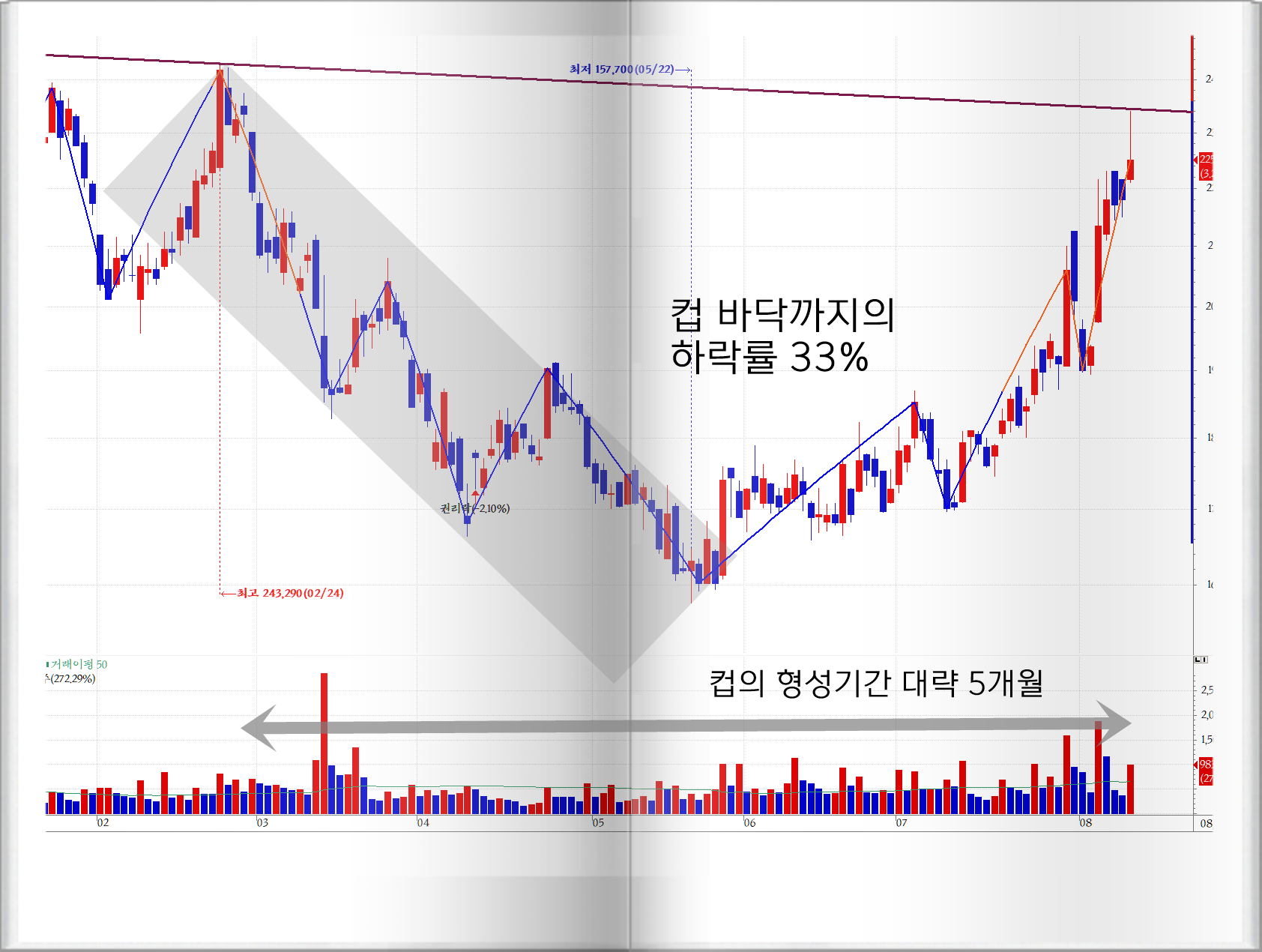 너무 깊지 않아야 합니다. 보통 이전 상승폭의 1/3 ~ 1/2 정도의 조정이 이상적입니다. 너무 깊은 조정은 종목 자체가 병들었다는 신호일 수 있습니다. 윌리엄 오닐에 따르면, 컵의 맨 윗부분이라고 할 수 있는 천정으로부터 조정을 받기 시작해 컵의 맨 아랫부분인 바닥까지는 적게는 12~15%에서 많게는 33% 이상의 주가 하락률을 기록한다고 했습니다.